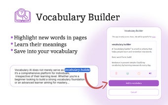 Vocabulary Builder เป็นส่วนขยาย Chrome ฟรีที่ออกแบบมาเพื่อช่วยให้ผู้ใช้ขยายคำศัพท์และพัฒนาทักษะภาษา มันช่วยให้ผู้ใช้สามารถเน้นคำและวลีใหม่ ๆ บนหน้าเว็บใด ๆ เรียนรู้ความหมายในหลายภาษา และบันทึกไว้ในพจนานุกรมออนไลน์ เครื่องมือนี้ใช้วิธีการจำแบบ Ebbinghaus Curve Memorization Interval เพื่อเพิ่มการจดจำ ทำให้เหมาะสำหรับผู้เรียนทุกระดับ